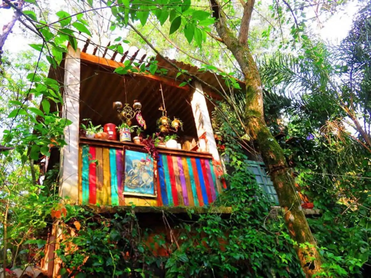 Para subir na cabana é preciso subir uma escada tipo bombeiro de madeira. A cabana toda colorida é para um casal e com certeza garante uma experiência única.