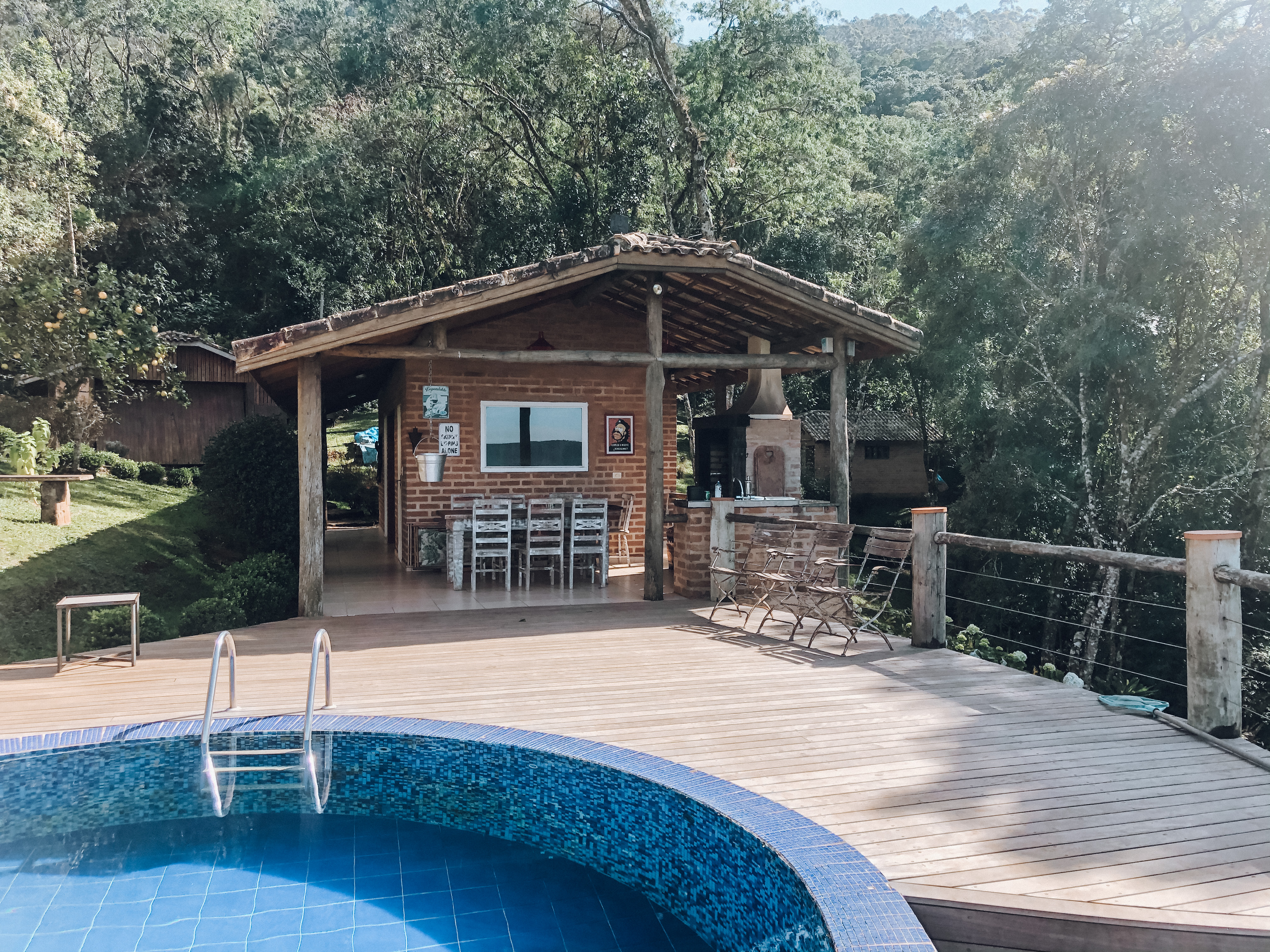 O lado externo da casa se tornou nosso queridinho por motivos óbvios: a paisagem, que transforma todas as janelas de dentro da casa em quadros, o deck e a piscina redonda, linda (porém um pouco gelada), onde passamos quase todas as manhãs e tardes, antes da temperatura cair.