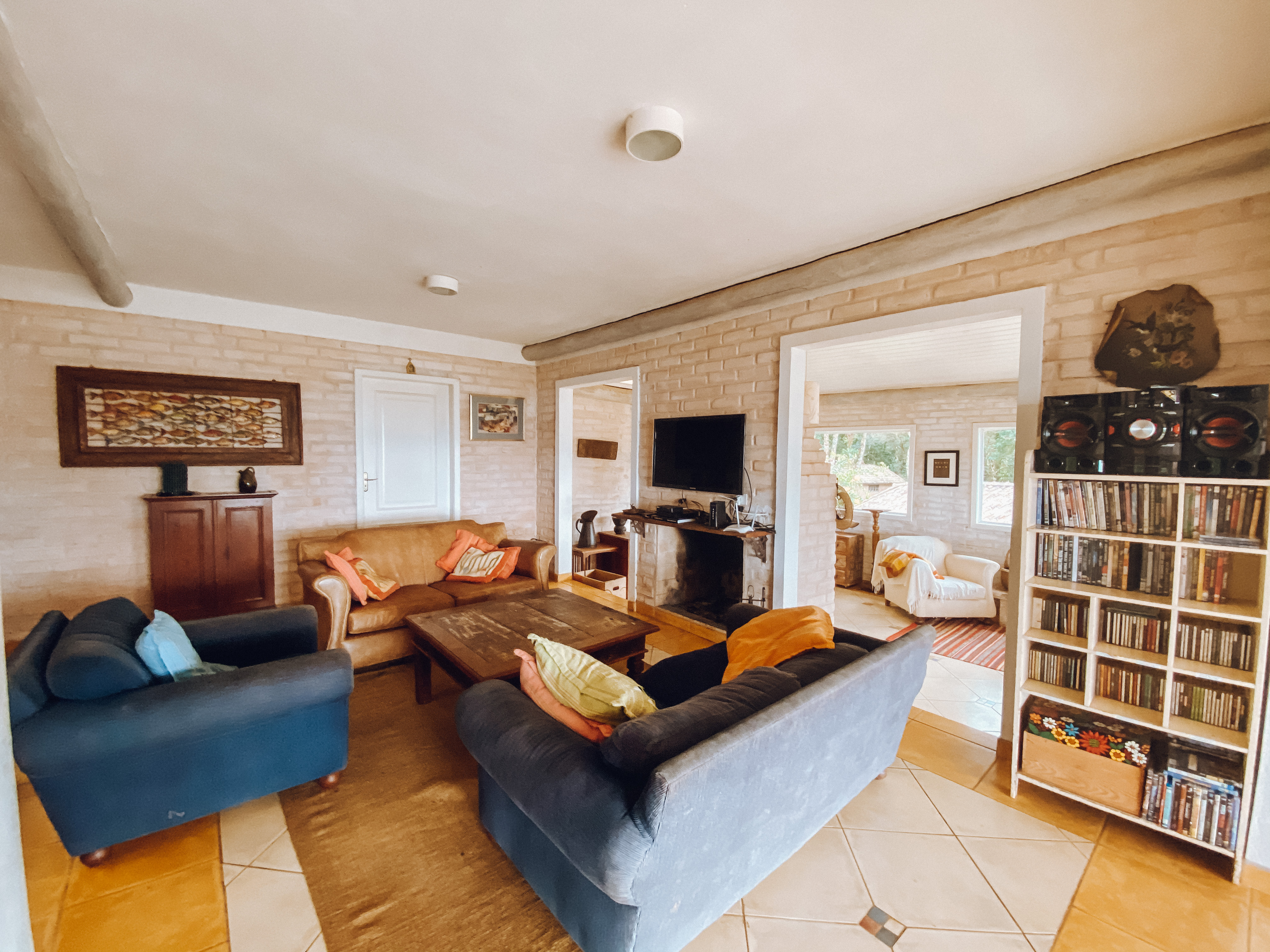 A parte interna da casa é bastante aconchegante e mesmo com todas essa conexão entre ambientes, tem cantinhos ótimos para um fondue a dois, por exemplo. Mas se sua ideia é ir em família ou em um grupo de amigos, essa arquitetura também favorece e muito a convivência entre todos.